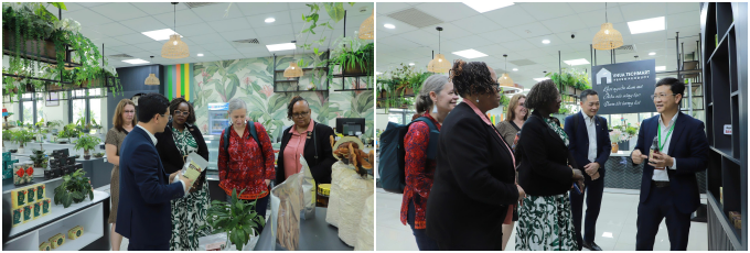 The delegation visits VNUA TECHMART. Assoc. Prof. Dr. Nguyen Viet Long, Director of the International Cooperation Office, introduces products at VNUA TECHMART to the ILRI delegation.